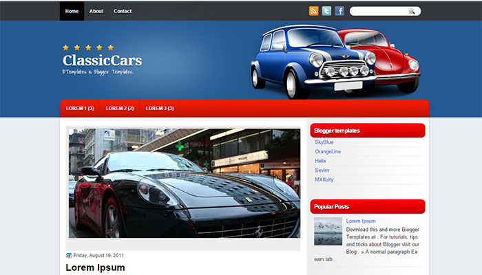 ClassicCars is a free blogger template with 2 columns, right sidebar, fresh look, exclusive design for Blogger, slideshow, social bookmarking icons and vectorial elements.